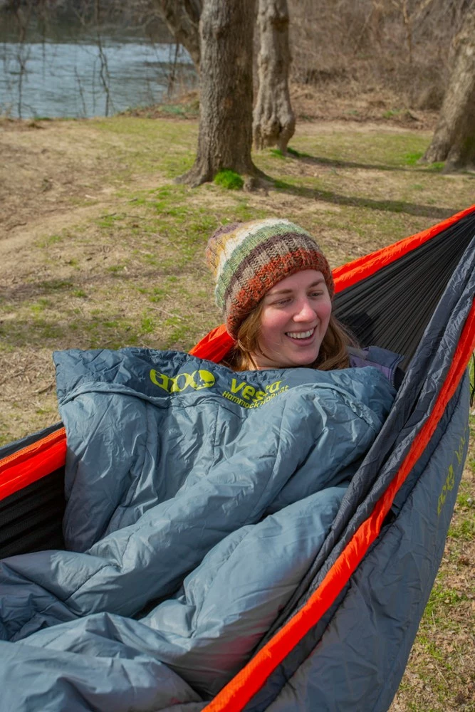 Protecting you from a range of inclement weather conditions, the ENO Vesta hammock top quilt is built with 2 layers of PrimaLoft® insulation for superior warmth during your hammock adventures.