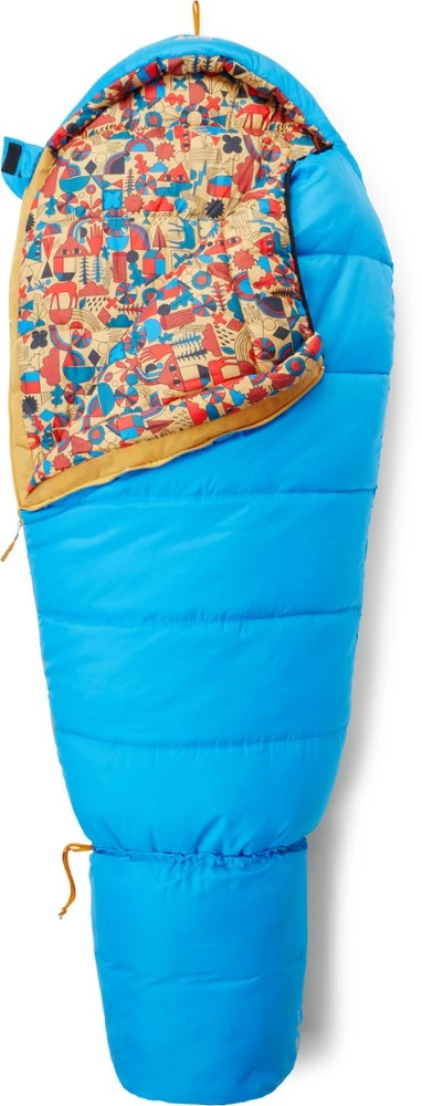 Our warmest synthetic backpacking bag for kids, the REI Co-op Kindercone 25 sleeping bag is now made with a recycled polyester shell and lining. And it adjusts to fit and stay warm as kids grow!