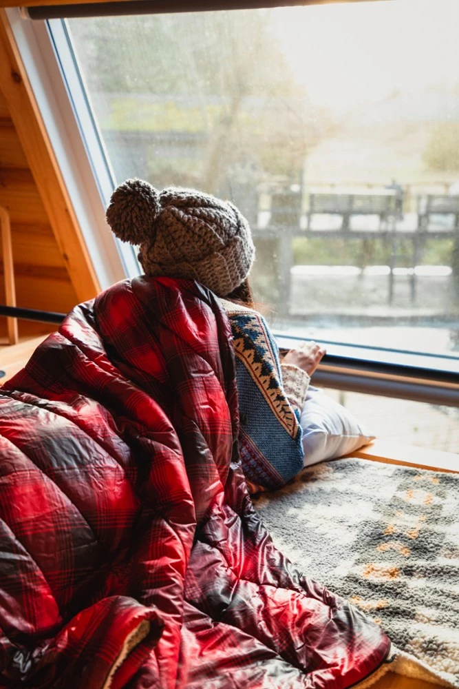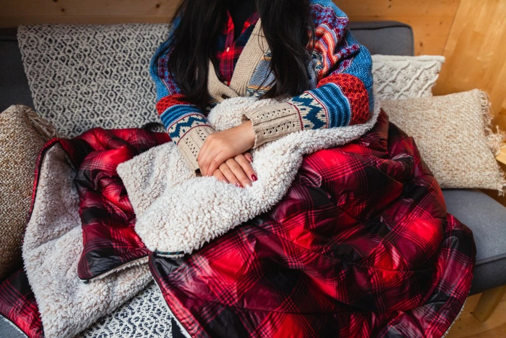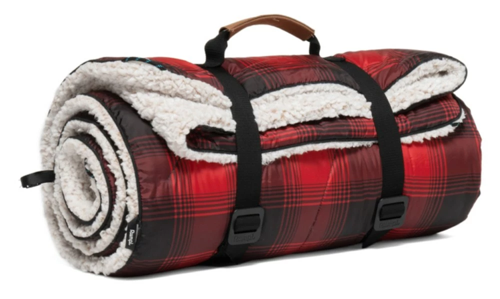 Fight the AC blasts and cool evening breezes in the comfort of the Rumpl Sherpa Puffy Ombre Plaid blanket, a packable, insulated throw with a soft sherpa fleece lining and classic puffy shell outer.