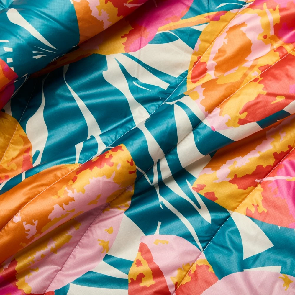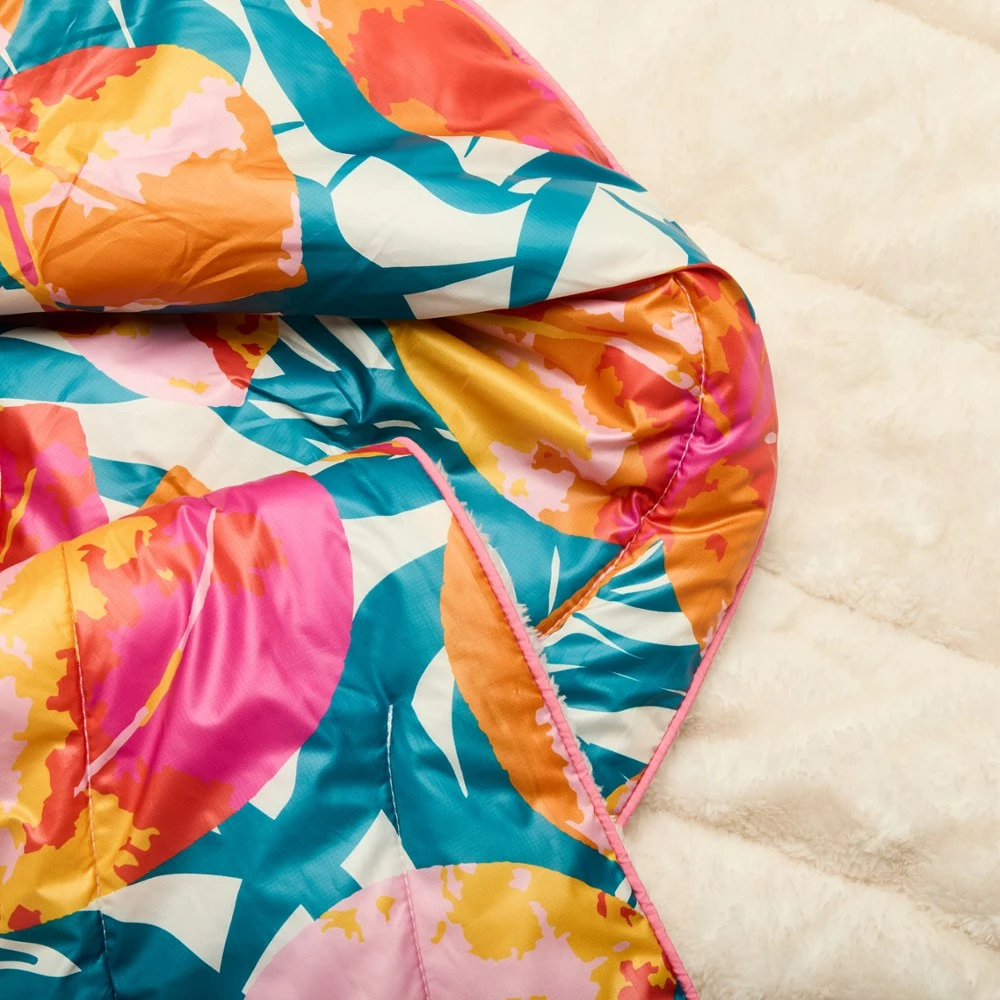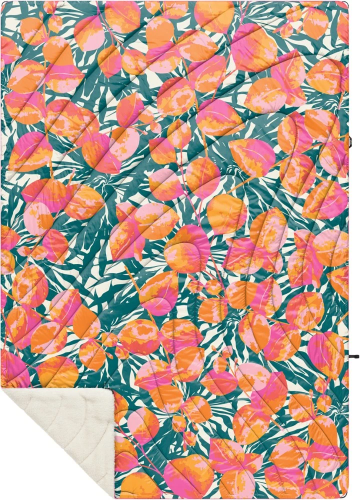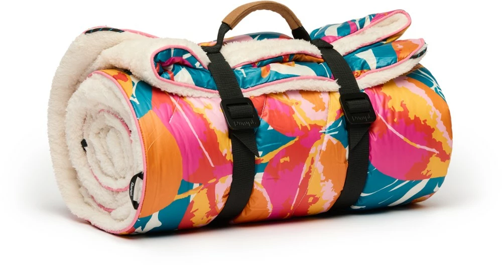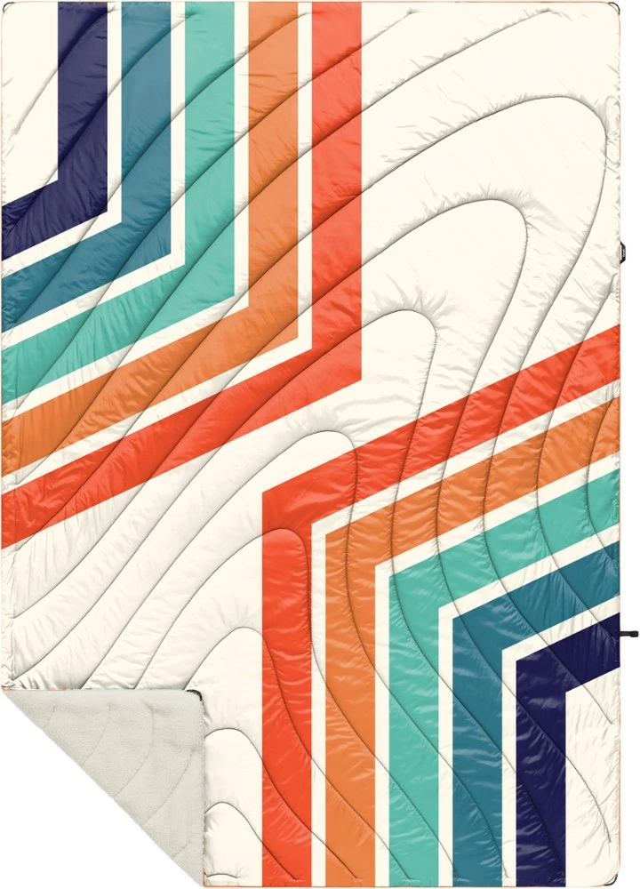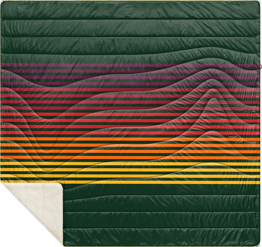 Fend off cool mountain breezes or settle in at home with the Rumpl Sherpa Puffy blanket, a packable, insulated throw with a soft sherpa fleece lining and classic puffy shell outer.