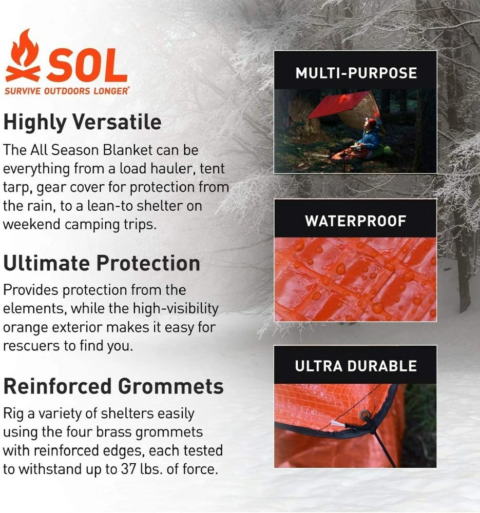 - Compact and waterproof, the All Season Blanket can help protect against hypothermia and keep you dry or to signal rescue teams with the bright orange color